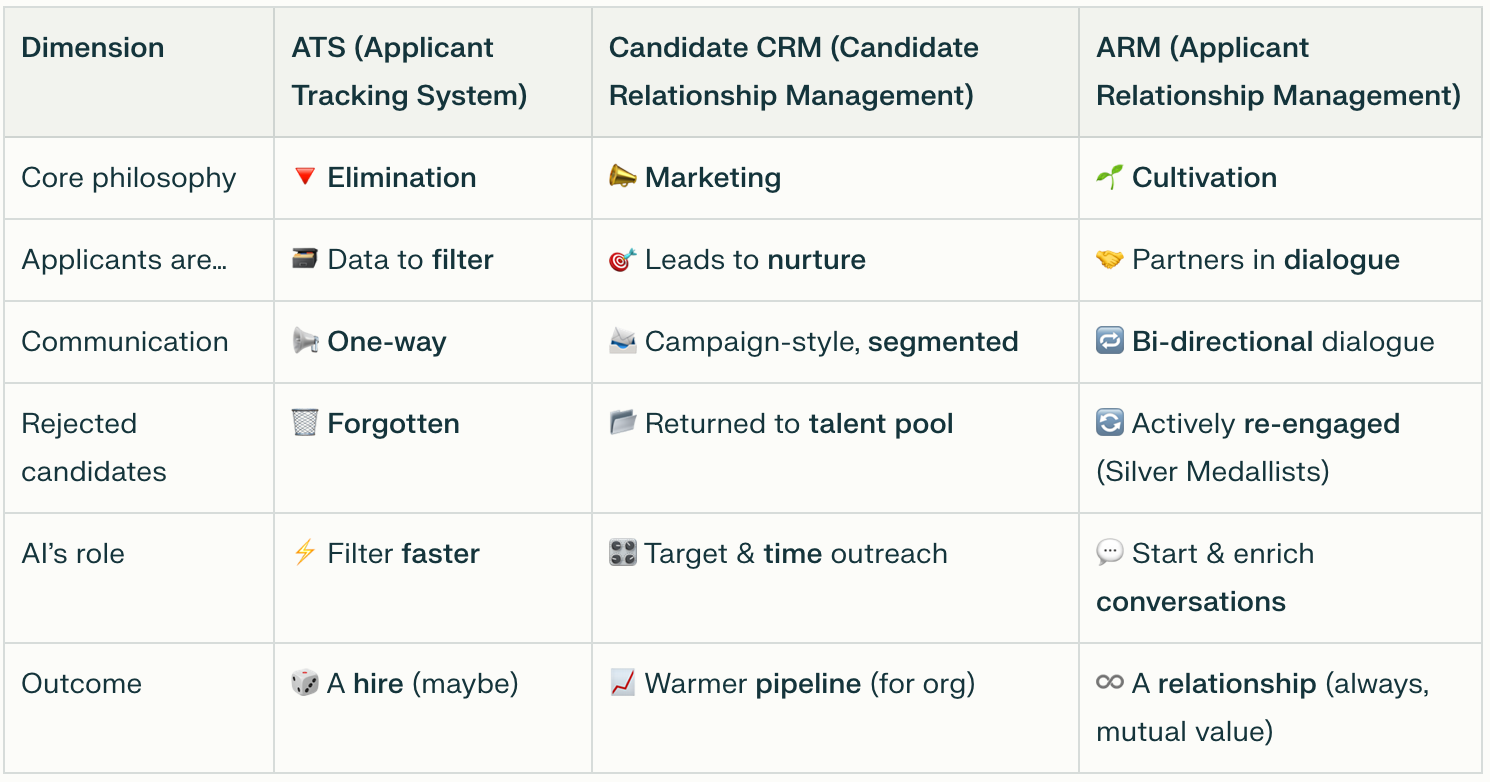 This article presents the case for a fundamental shift: from Applicant Tracking Systems (ATS) and Candidate Relationship Management (Candidate CRM) to a new paradigm we call Applicant Relationship Management (ARM). This is not incremental improvement. It is a necessary evolution that benefits organisations, people, and society.